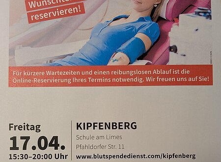 Für kürzere Wartezeiten und einen reibungslosen Ablauf ist die Online-Reservierung Ihres Termins notwendig unter www.blutspendedienst.com/kipfenberg Bitte mitbringen: Personal- und Blutspendeausweis (falls vorhanden).