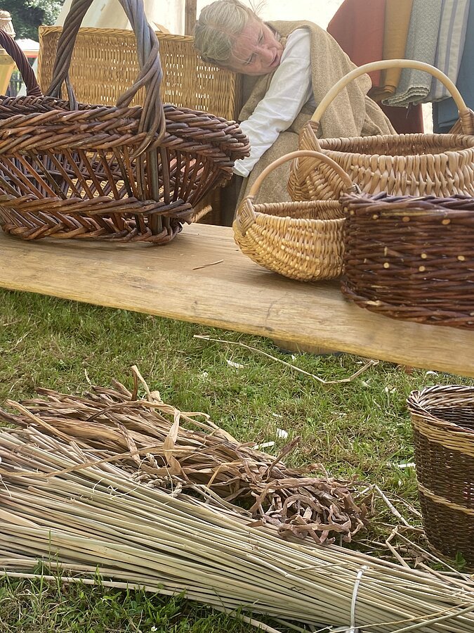 Es wird mit historisch-traditionellen Techniken aus Abbildungen der Antike gearbeitet. Brigitte Steinmann leitet sämtliche Arbeitsschritte bei der Entstehung eines kleines Obstkörbchens an.