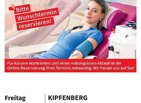 Für kürzere Wartezeiten und einen reibungslosen Ablauf ist die Online-Reservierung Ihres Termins notwendig unter www.blutspendedienst.com/kipfenberg Bitte mitbringen: Personal- und Blutspendeausweis (falls vorhanden).